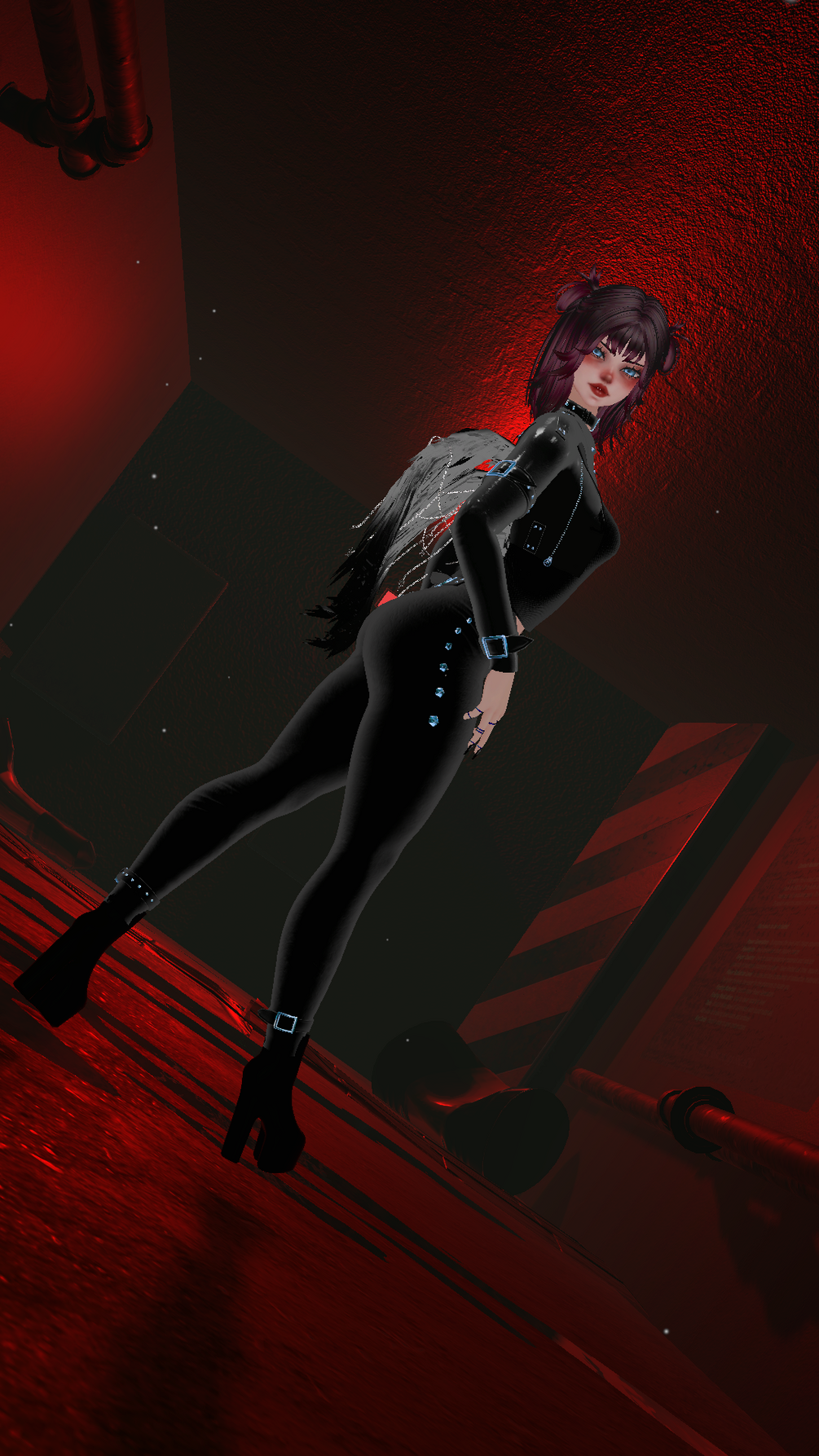 - Metals on the bodysuit. biker top, tube top, pants, choker
